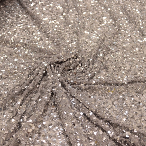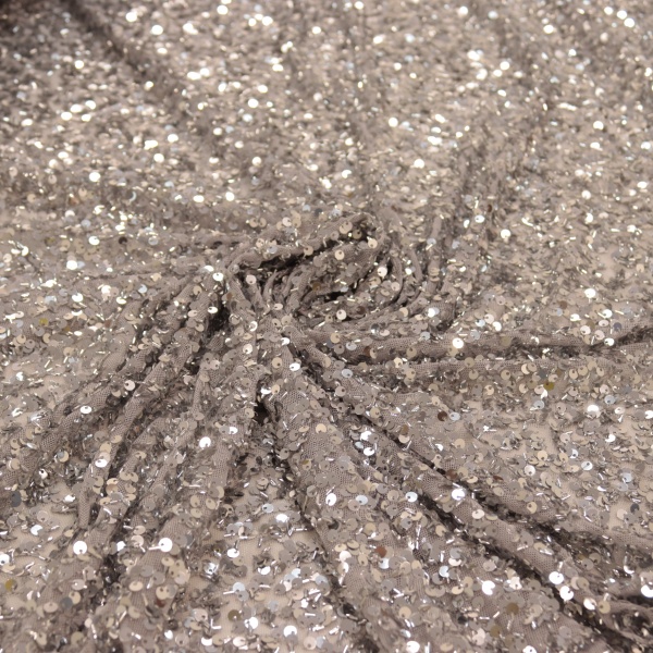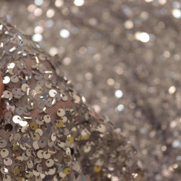 Tecido com pequenos paetês bordados sobre o microtule. Possui um caimento pesado, e ao mesmo tempo transmite a sensação de fluidez no movimento.